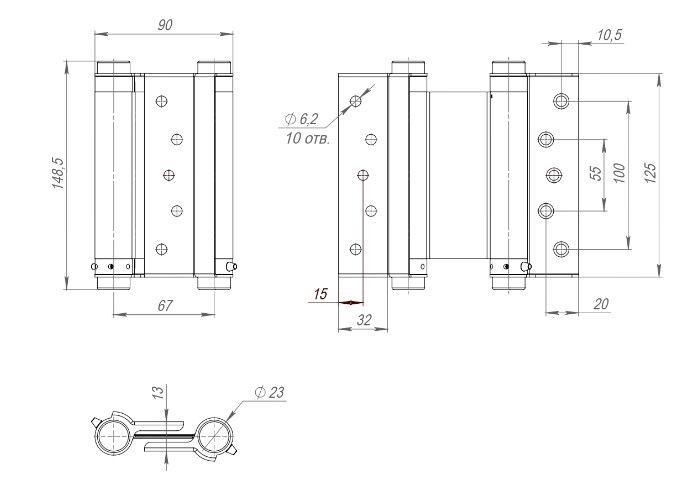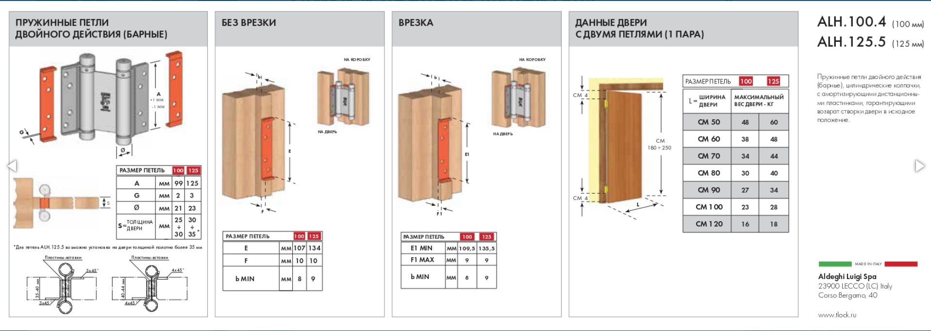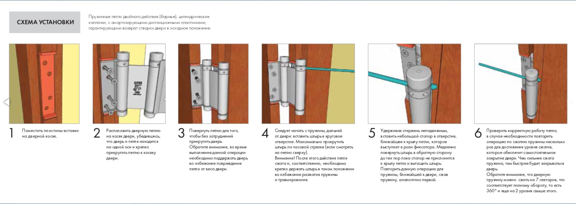 Петля двусторонняя (она же барная, пружинная, петля метро) применяется для деревянных дверей. Позволяет двери открываться в обе стороны, возвращает дверь в центральное положение (в створ). Втулки петель выполнены из техно-полимера, обеспечивают амортизацию, гарантируют тихую и плавную работу, увеличивают срок службы более 200 000 циклов. Специальный тормоз замедляет движение двери и уменьшает количество колебаний, это дает возможность использовать двери большего веса и размера. В комплекте с петлями идут полимерные пластины, облегчающие установку и гарантирующие надежное крепление.