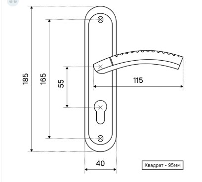 Ручка на планке под замок и цилиндровый механизм. Материал - алюминиевый сплав, гальваническое покрытие. Межосевое расстояние - 55 мм, размеры планки - 40х187 мм, длина ручки - 120 мм. В комплект входят винтовые стяжки и квадратный штырь (8х8 мм) 100 мм.