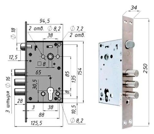 Замок врезной под цилиндровый механизм , предназначен для металлических и противопажарных дверей. Замок снабжен 3 ригелями и защелкой. Межосевое расстояние 85 мм. Вылет ригелей 26 мм, диаметр 18.8 мм. Защелка работает только от ручки. Ширина плани 34 мм