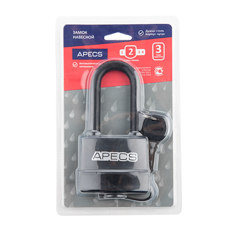 Всепогодные навесные замки Apecs серии 50 - высококачественные навесные замки из чугуна в пластиковом чехле, превосходящие по качеству большинство аналогов на рынке. Пластиковый чехол выполнен из морозоустойчивого материала, не подверженного растрескиванию при температуре до (-40) градусов. Заглушка на цилиндр из мягкой резины превосходит аналоги с пластиковой заглушкой по сроку службы. В замках используется полноразмерный латунный цилиндровый механизм и пружины из нержавеющей стали. Фиксация дужки с двух сторон обеспечивает надежное запирание замка. В замках реализована функция автоматического запирания: запирание замка осуществляется нажатием на дужку без использования ключа.
